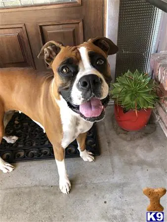 65 pound Pardi mix brown and white. Very smart, calm and loving. Good with kids