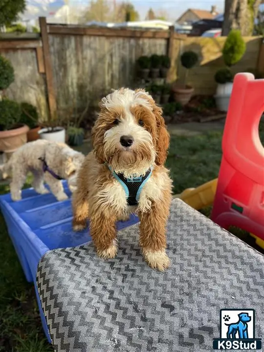 Altair is an Australian Labradoodle Mini at 20 lbs. Located in Seattle, WA Full panel genetics done. Beautiful soft wavy non shedding coat ! Altair has a sweet temperament , loves to play fetch and great with family ,small children, dogs, new people. Sleeps inside my room on soft calming donut bed. If interested email Aimee at a6santa @ hotmail Thank you!