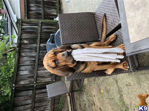 Bharat is a remarkable specimen of a blood hound. Larger than most male bloodhounds he is powerful, very strong yet affectionate, friendly and playful. His expression is noble, dignified, contemplative albeit somewhat solemn.