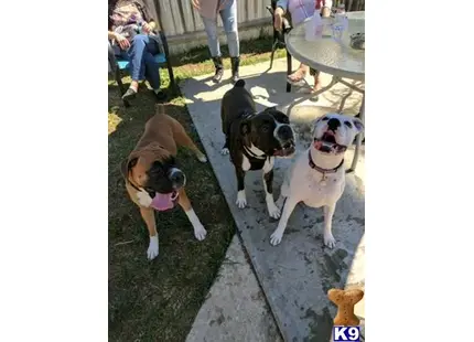 Extremely attractive male boxer, family dog line of obedient dogs, he is full blooded boxer, brindle with white on his face, legs and stomach. Extremely friendly.