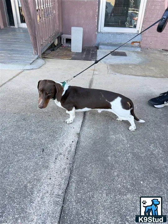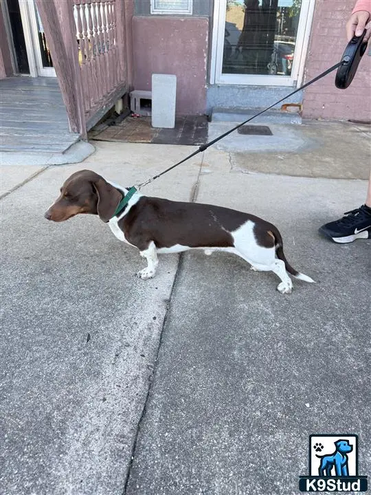CKC registered piebald miniature dachshund. He is on the bigger end of the scale for a miniature. He is 11 lbs, 18 inches long from breast plate to rump, and height is 6 inches from ground to shoulder. He has a great temperament. He has beautiful liver and white markings with light ticking on feet, and precious green eyes. He loves to ride in cars, side by sides, 4 wheelers, tractors, and boats. He is a good deer tracker as well. He also loves cuddles and kisses from anyone that will give attention. Although he is registered, I am discounting his stud fee as this is his first time providing his services.