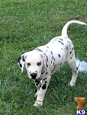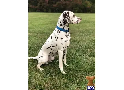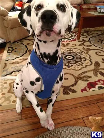 Dawkins is almost 9 months old. He currently weighs 74 lbs. He has the friendliest, loving, and fun personality. He was easily trained. Not aggressive at all. He isnt a Barker unlike my last Dalmatian. Shots are up to date.