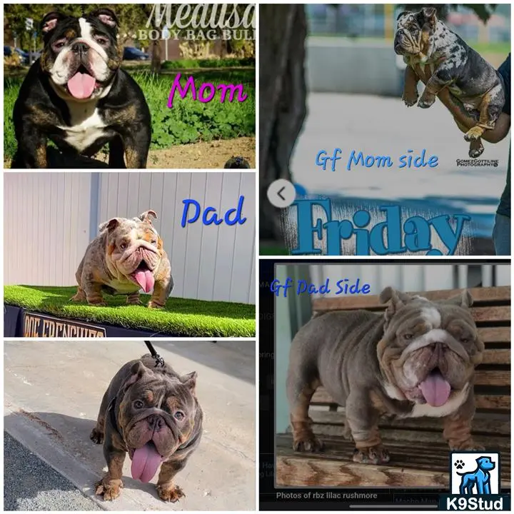 Mini/ Micro English Bulldog, AKC, Lilac Tri. He is 11 1/2 inches short and 30lbs of thickness, Super compact, and great structure. Great Health. True Mini/ Micro English Bulldog. Change up your litter with this Mini/ Micro Bulldog Stud. Includes 2 A.I.s. Great bloodline. Last pic is of his parents and grandfather from each side.