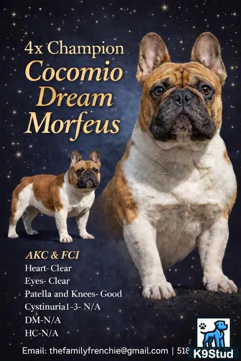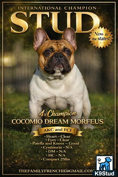 The Family Frenchie is proud to welcome, this amazing top rated Red Pied / Fawn Pied stud from Europe to New York. Morfey is a highly impactful stud, that carries dominant red fawn blanket pied genes. The unique patterns and deep reds, he has thrown, has catapulted his litters to go viral! He has a square, muscular, compact body at 25 lbs. Great top line, full neck, beautiful head, and very expressive ears and eyes. Standard AKC and FCI beeeder. Stud contract. Fresh chilled extended, for shipping throughout the US and Canada. Heart- Clear Eyes- Clear Patella and Knees- Good Cystinuria- N/A DM-N/A HC-N/A