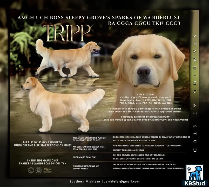 Meet AmCH UCH BOSS Sleepy Groves Sparks of Wanderlust RA CGCA CGCU TKI CCC3 Tripp! Tripp is the epitome of a Golden Retriever sweet, steady, and eager to please. Backed by an exceptional pedigree, he excels as a dependable service dog and has been highly competitive in the show ring with limited showing. From the rally ring to scentwork to trick training, he is happy to do it all. His calm, resilient temperament and happy-go-lucky nature make him a joy to work with and live alongside. He earned his first AKC point going WD in our conformation debut as an owner-handled team, then finished three 5-point majors and two Best of Opposite Sex wins from the classes, including one at a specialty show, all within just a month. He is well-proportioned with a balanced build, a nice short loin, and moderate bone beautiful and effortless movement and a proper wash‑and‑wear coat. His masculine yet refined head and soft expression perfectly reflect the breed standard. Serious inquiries are warmly welcomed from breeders dedicated to preserving solid temperaments, maintaining sound structure, and improving the health of our beloved breed. k9-data.org/dog/detail/1350937 ofa.org/advanced-search/?appnum=2609084 www.instagram.com/tripp_sparksofwanderlust?igsh=cHVwZjFnZWc5NzE3