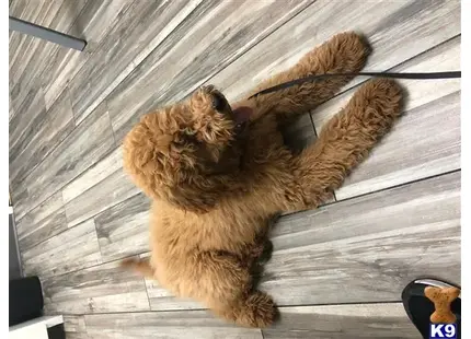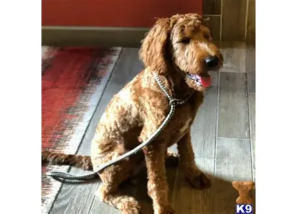 Murphy is a chocolate mini Merle Goldendoodle. He weighs 32 lbs. He is the biggest sweetheart and loves everyone he meets! No restrictions.
