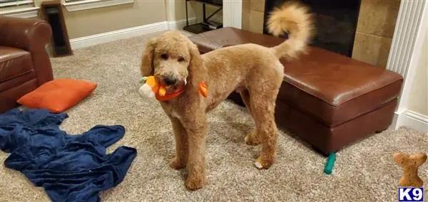 Golden-doodle one-year-old. He is a handsome, well-mannered, super smart, and playful dog. Very empathetic and responsive. He has white on his neck, the tip of his back paws, and tail. He has blond curly hair.