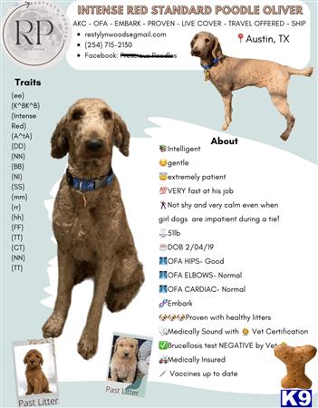 SHIPPING AVAILABLE and live cover as well Artificial Insemination Offered Shipping offered 50lb Proven Texas Live Cover Offered Brucellosis Negative Travel Offered for Live Cover OFA Elbow, Basic Heart, and Hips Embark tested Oliver is a sweet, intelligent, and gentle poodle. He has sired two beautiful litters. He currently has a short haircut. He is from a long line of red poodles. He is AKC registered and has a certified pedigree. He is up to date on vaccines.