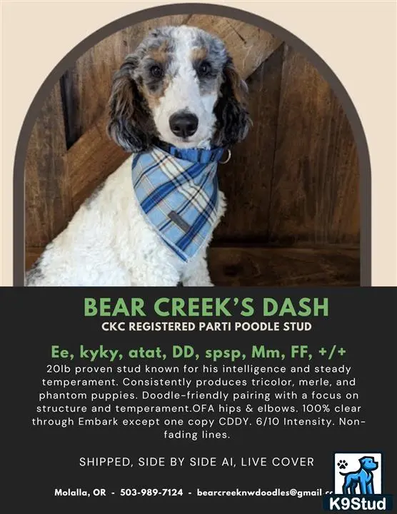 Dash is a 20-lb proven poodle stud with excellent health testing, highly desirable coat genetics, and an outstanding temperament. He is OFA certified for hips and elbows and Embark tested, clear of all genetic conditions except one copy of CDDY. Dash’s coat genetics include BB, Ee, FF, DD, and merle, allowing him to consistently produce striking merle, phantom, and tricolor puppies with great coats, structure, and predictable size. He is exceptionally intelligent, sweet, and even-tempered, making him easy to work with and a reliable producer for serious breeding programs. Dash is an ideal poodle stud for Bernese Mountain Dog and Bernedoodle programs, Australian Shepherd and Aussiedoodle, Golden Retriever and Goldendoodle, Labrador and Labradoodle, as well as Cavalier and Cocker Spaniel crosses. Nationwide shipping available shipping costs are the responsibility of the bitch owner. Stud fee $900.
