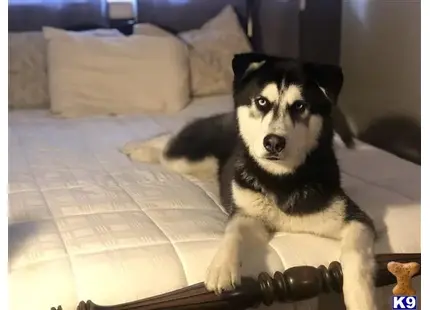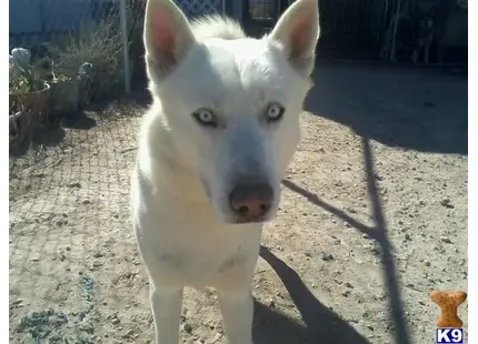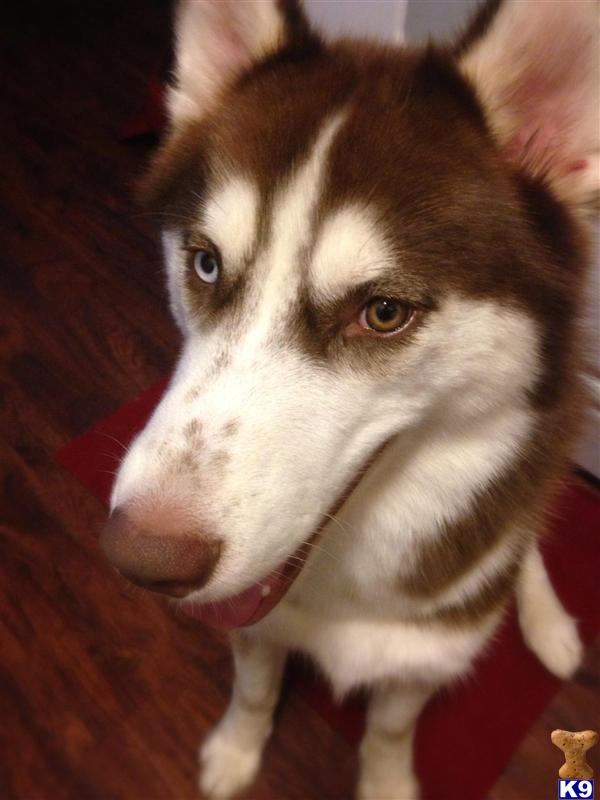 Red and white Siberian Husky, one blue eye and one green eye.distinctive markings and is very intelligent. well behaved, great with other dogs and children. Four generations of pedigree papers up to date on all his shots He is very good natured loving. He is ready and available to stud. I require all female up to date on all vaccinations, bathed and free of fleas/ticks. Please let me know if you have any questions