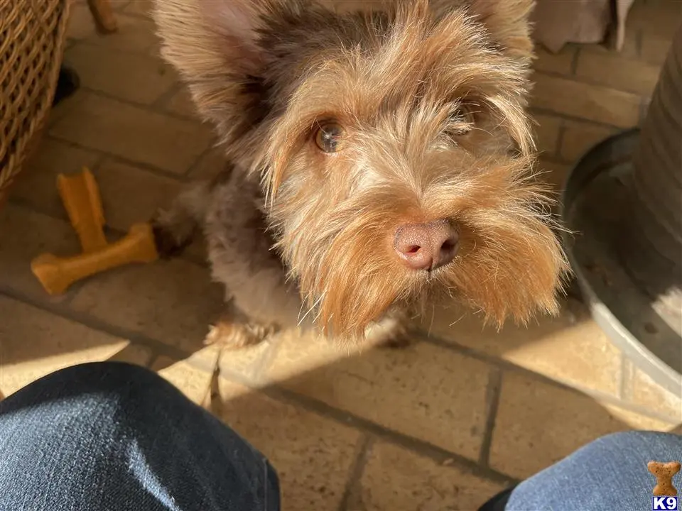 Winnie is a very small Chocolate Yorkie. 7.1 pounds. Sebring, Florida. He is playful, affectionate, well mannered, and handsome with gleaming white teeth.